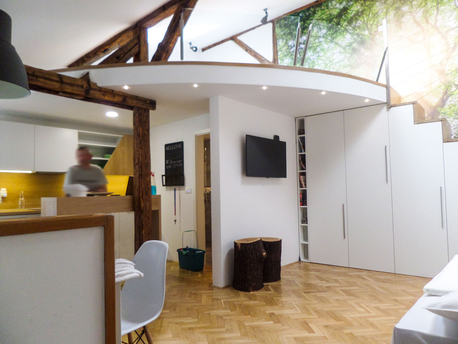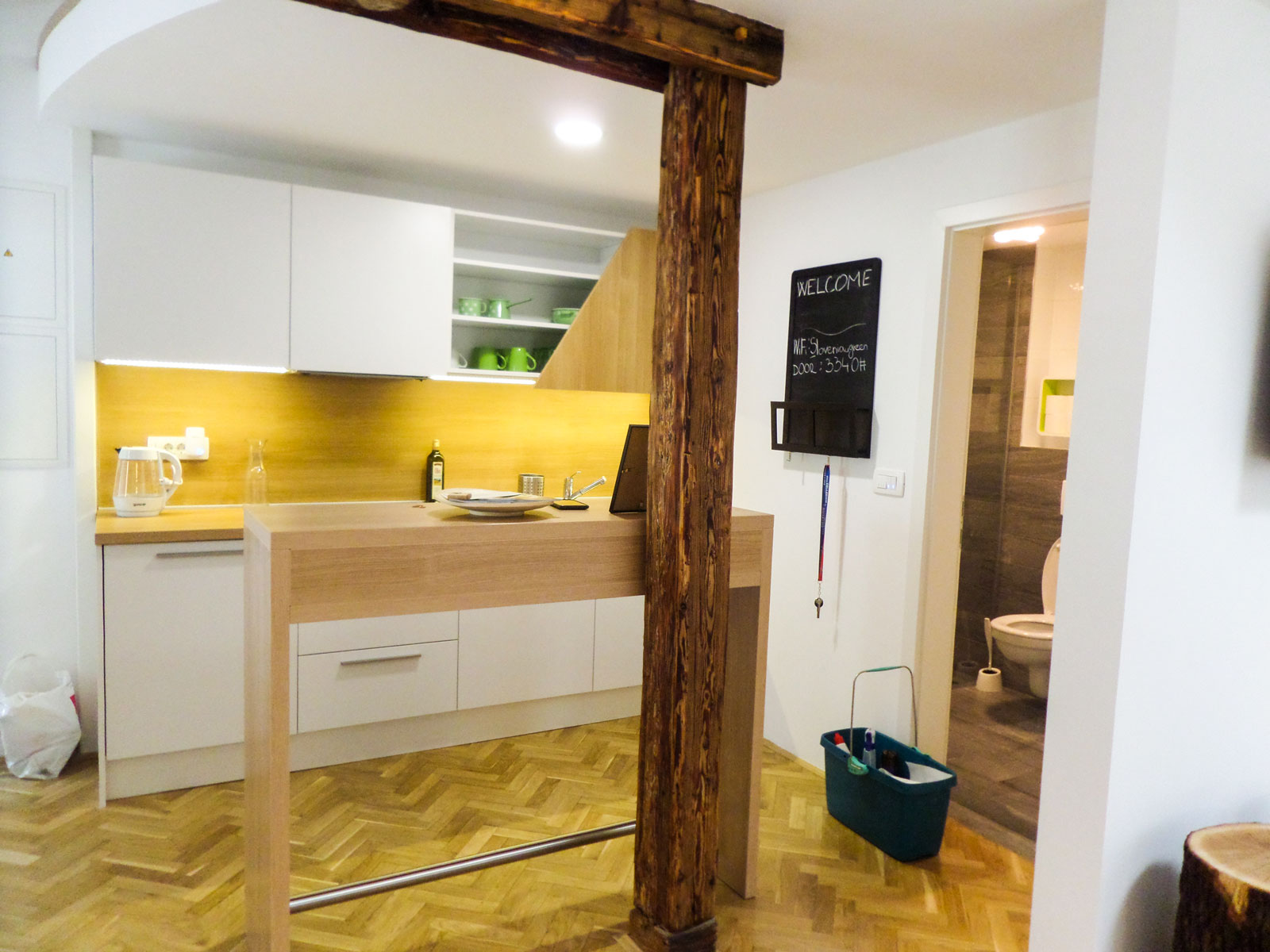 Kuhinja je izdelana iz materiala fenix s črnimi visečimi elementi ter beige spodnjimi kuhinjskimi elementi. Oblikovanje kuhinje je povezano s stensko oblogo v nadaljevanju v kateri se skrivajo predali, funkcionalni prostori ter wc.