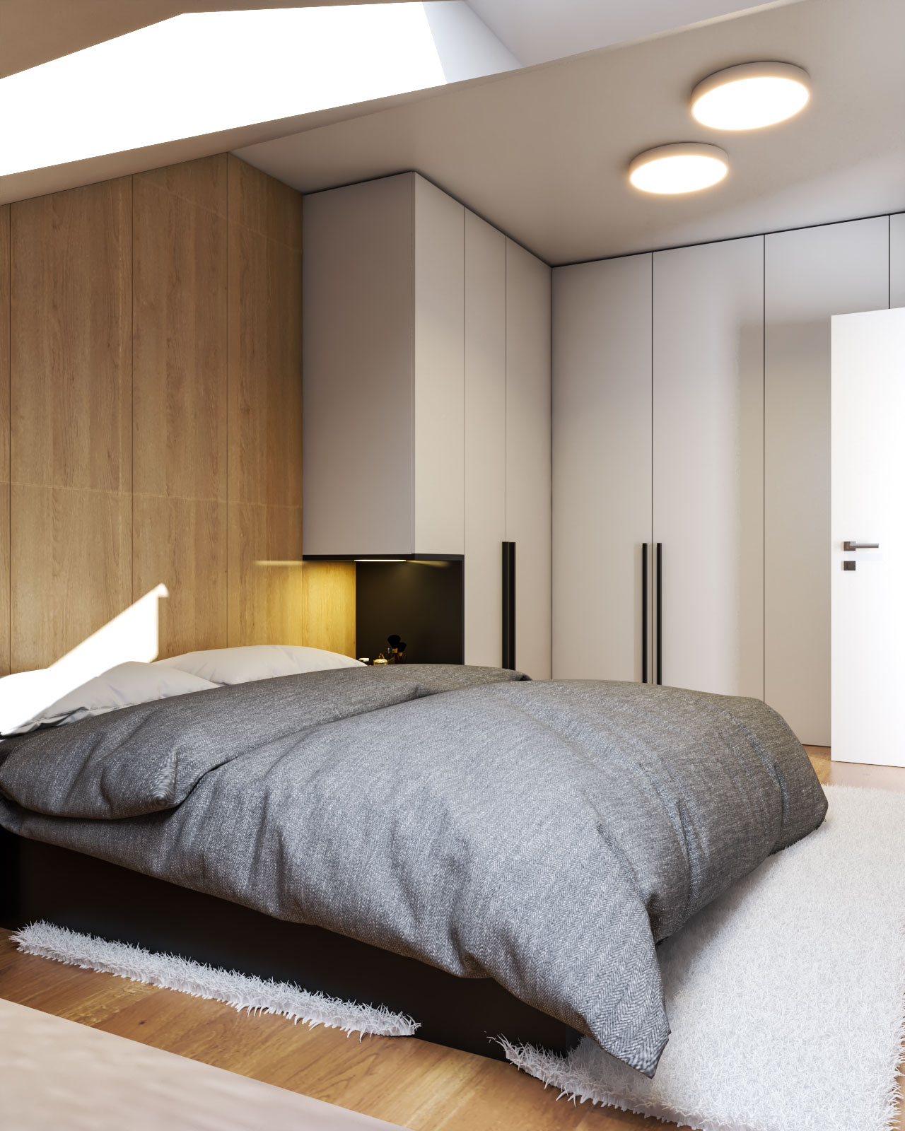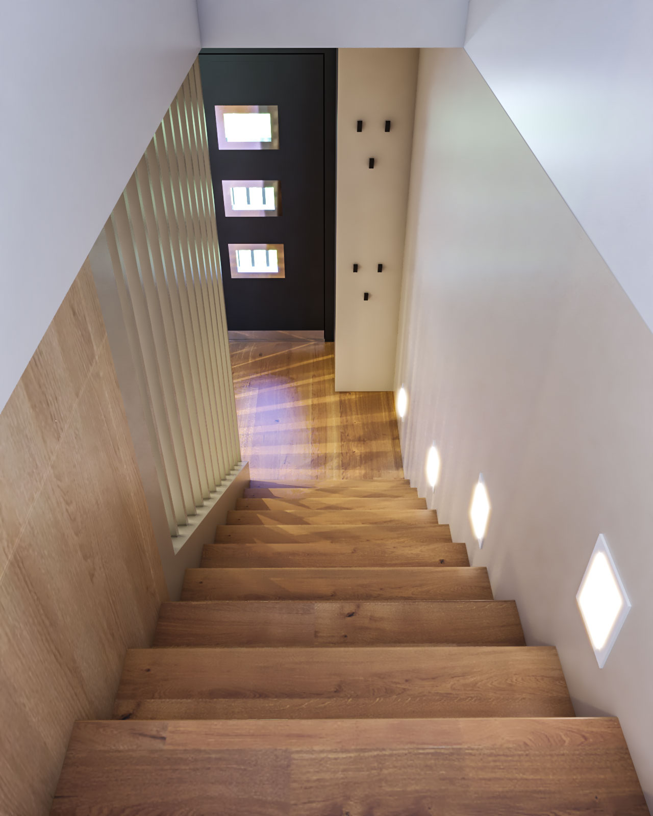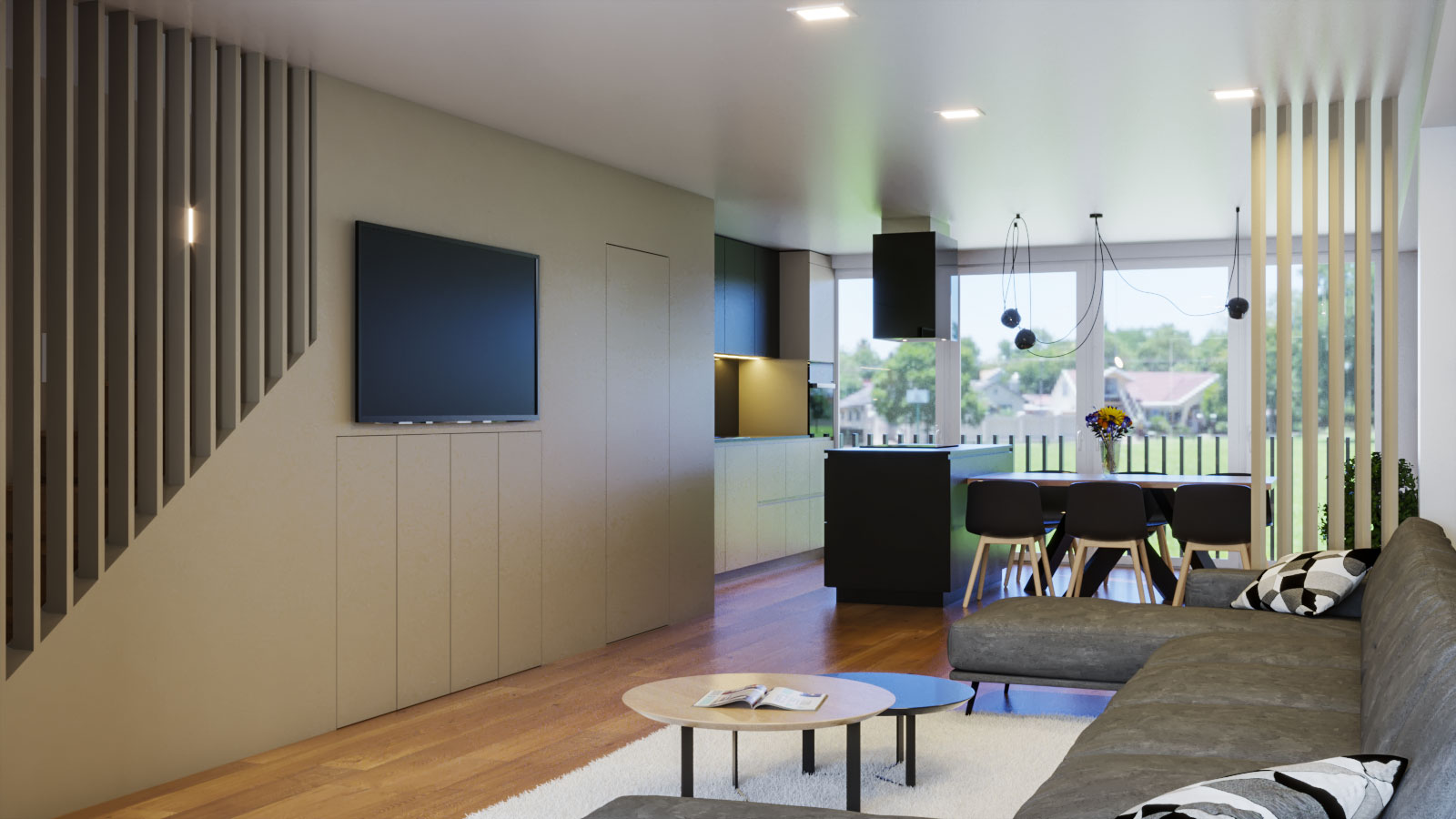 Projekt je izdelan v kombinaciji s svetlo rjavo barvo, beige, belo mat in mat črno. Dodan je les kot parket in kot stenska obloga.