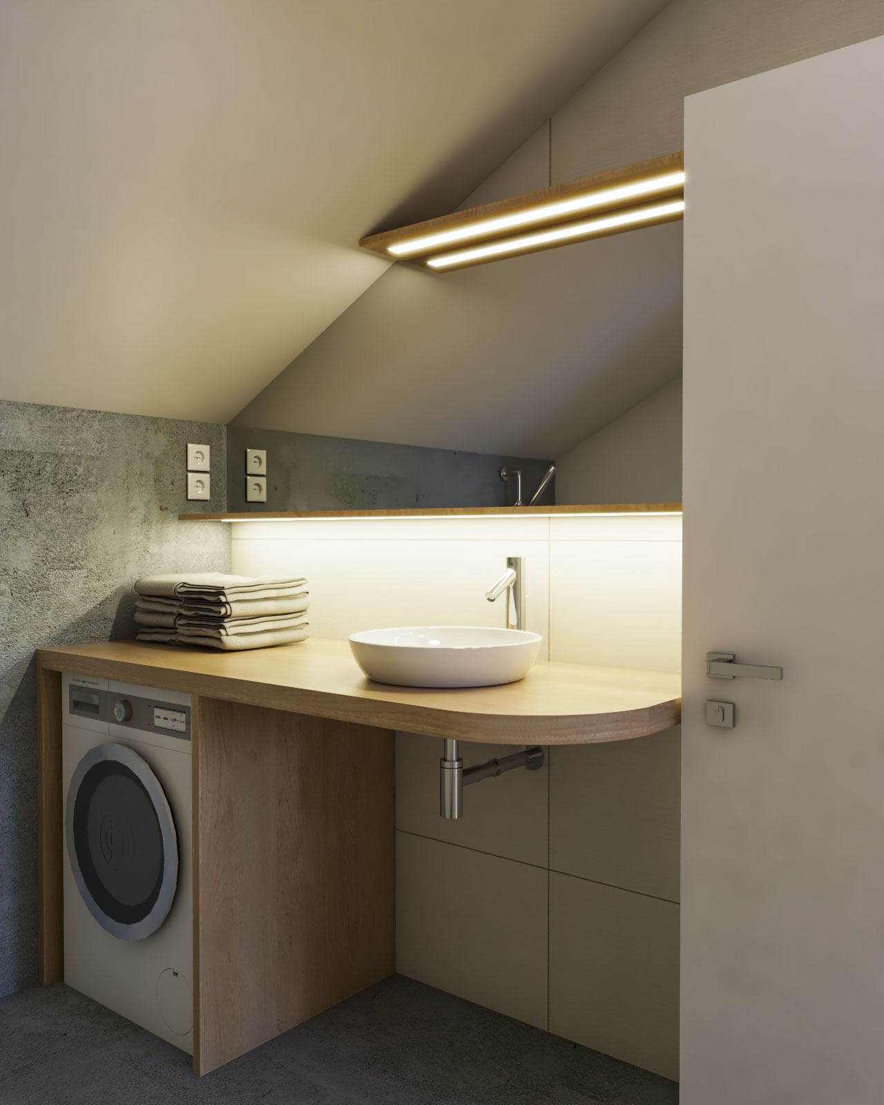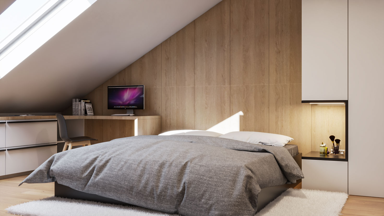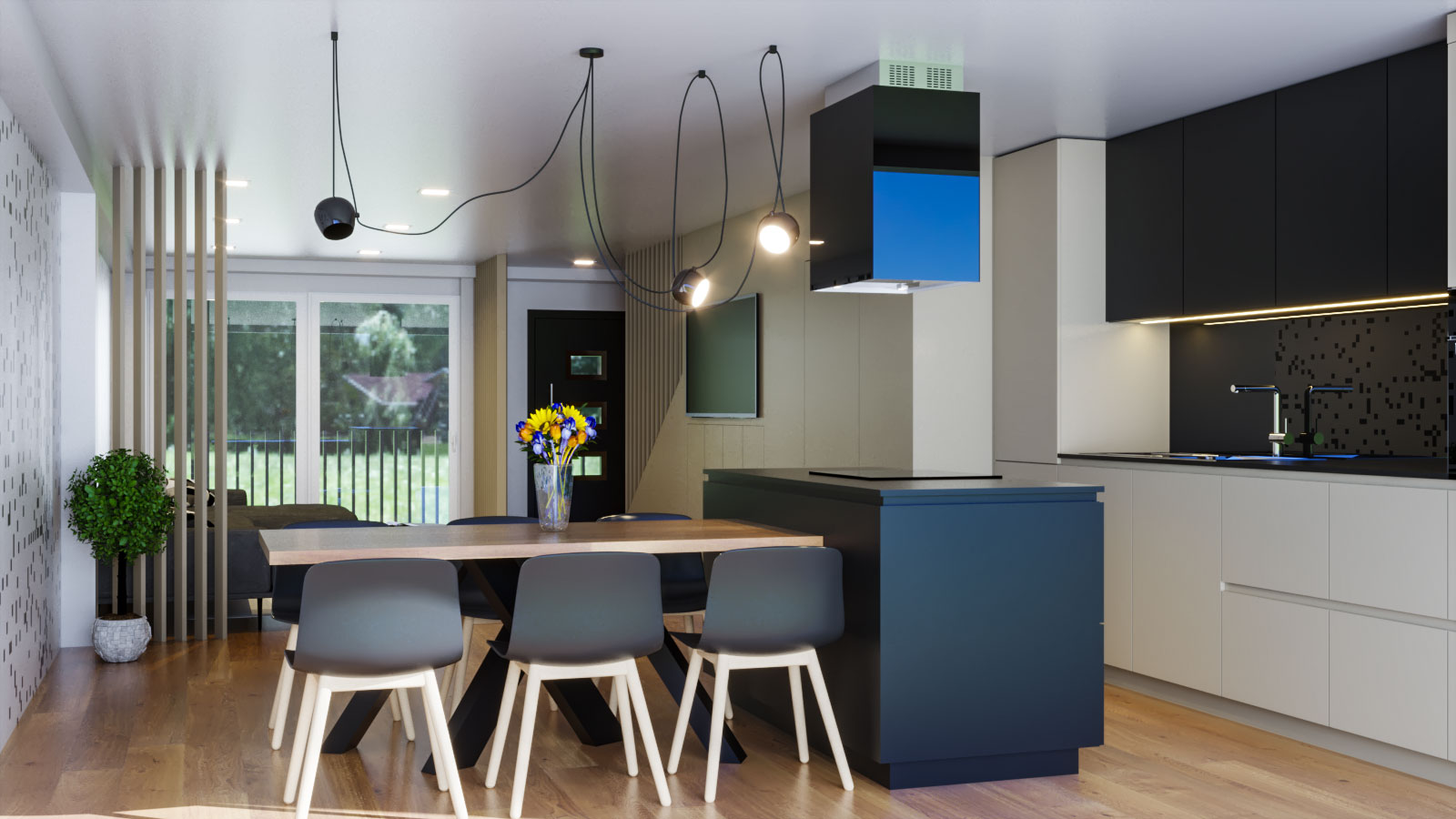 Projekt je izdelan v kombinaciji s svetlo rjavo barvo, beige, belo mat in mat črno. Dodan je les kot parket in kot stenska obloga.
