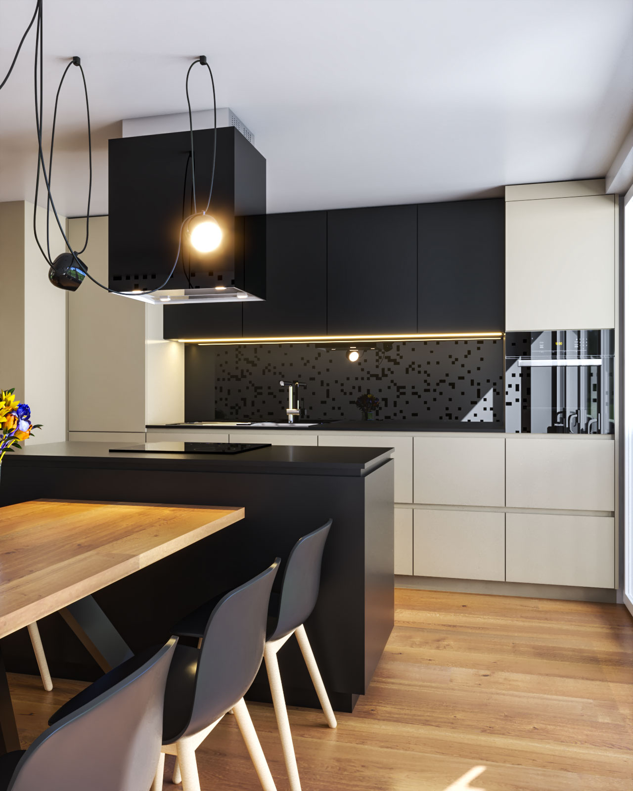 Kuhinja je izdelana iz materiala fenix s črnimi visečimi elementi ter beige spodnjimi kuhinjskimi elementi. Oblikovanje kuhinje je povezano s stensko oblogo v nadaljevanju v kateri se skrivajo predali, funkcionalni prostori ter wc.