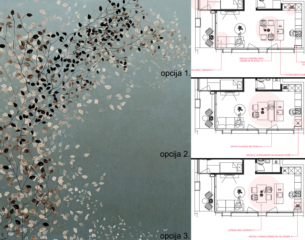 Pri oblikovanju interierja vam ponujamo tudi tri izdelane opcije postavitve osrednjega prostora, ki vam omogočajo vpogled v različne možnosti razporeditve pohištva, barvnih kombinacij in dekorativnih elementov. Na ta način poskrbimo, da bo vaš osrednji prostor funkcionalen, eleganten in v skladu z najnovejšimi trendi interier dizajna.