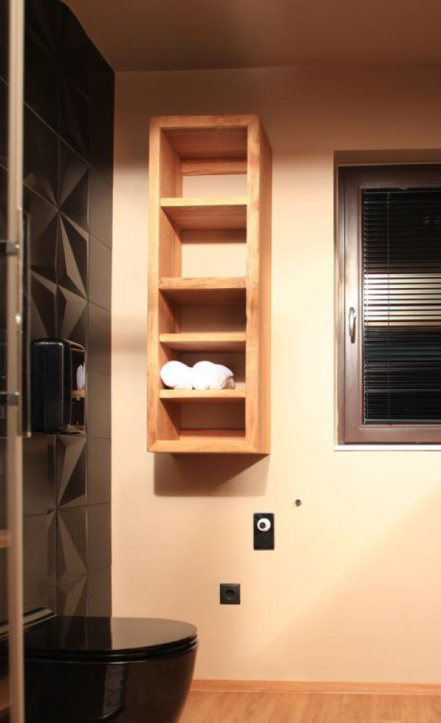 Kuhinja je izdelana iz materiala fenix s črnimi visečimi elementi ter beige spodnjimi kuhinjskimi elementi. Oblikovanje kuhinje je povezano s stensko oblogo v nadaljevanju v kateri se skrivajo predali, funkcionalni prostori ter wc.