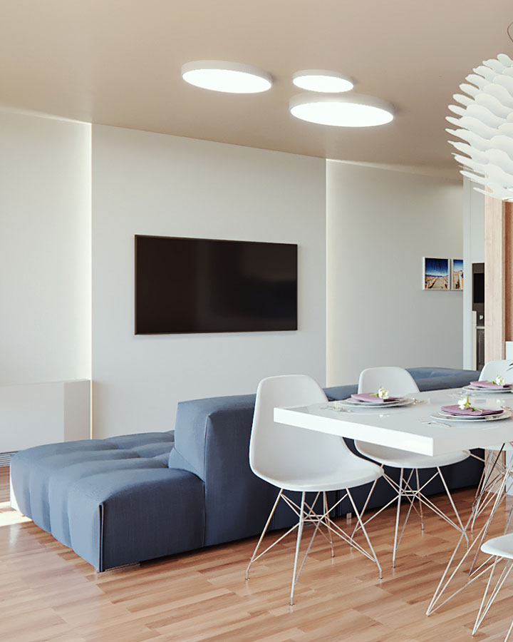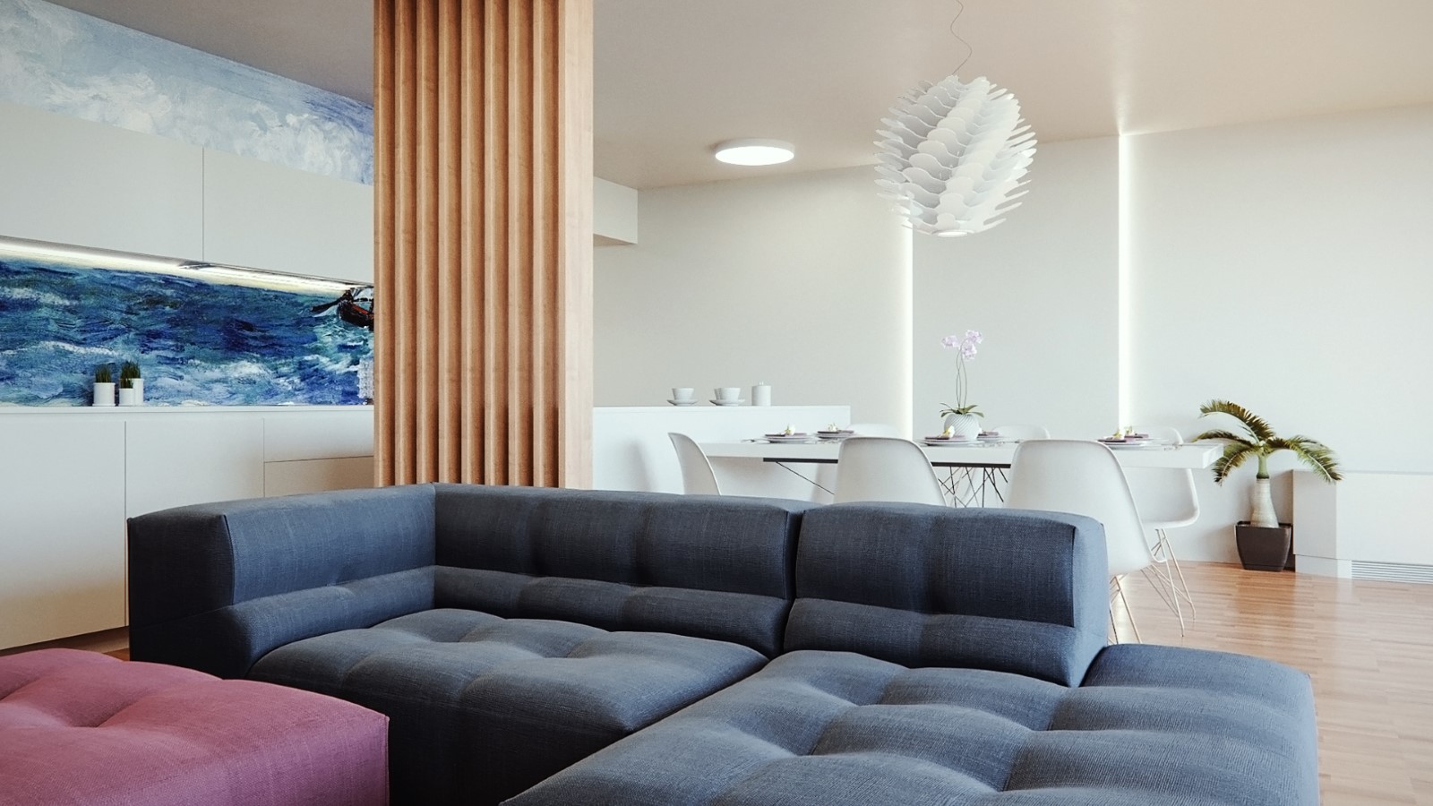 Izdelava projekta notranje opreme v stanovanju objekta Feral v Portorožu. Interier je minimalističen kombiniran s parketom, hrast masivnim lesom z belo-modro barvno kombinacijo.